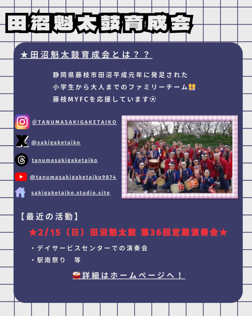 静岡県藤枝市田沼に居住する祭り大好きな人たちが集まり、平成元年に発足した、小学生から大人までのファミリーチーム👨‍👩‍👧‍👦