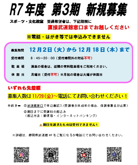 2025年11月1日 / 最終更新日時 : 2025年11月1日 admin スポーツ・文化教室【新規申込み】について スポーツ・文化教室 R7年度 第3期(1月~3月) 新規申込みについて 詳細は、右記より必ずご確認ください。 ☞ スポーツ・文化教室ページ Instagram ☞ 公式Instagram Twitter ☞ 公式Twitter